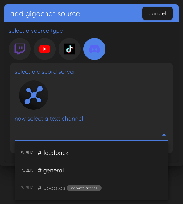 Once you picked a text channel, the "add source" button will appear on the popup. Clicking on it, will add the configured source to Gigachat. You can see your configured sources for Gigachat in the main configuration window now.