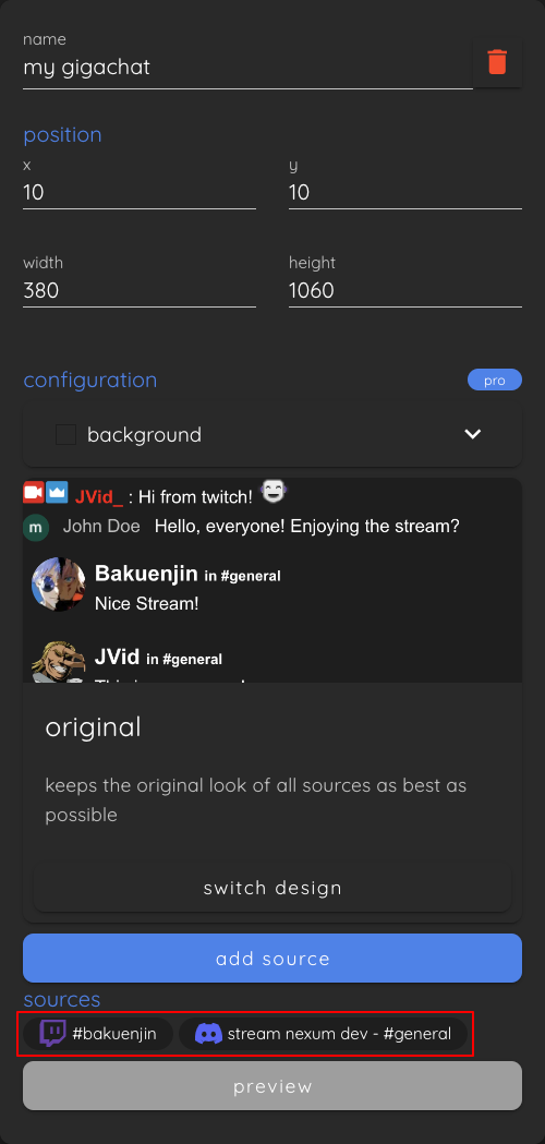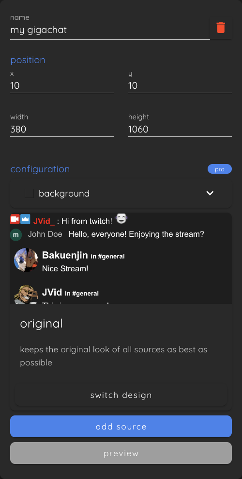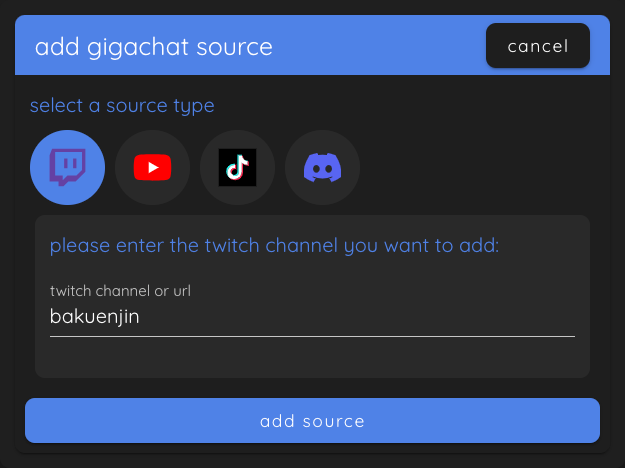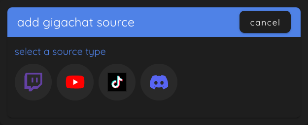 Now click on "add source" to add the second source to Gigachat. Keep in mind that you can add multiple different channels of the same platform to a single Gigachat widget.
