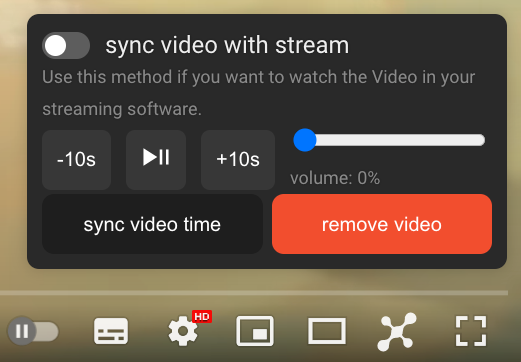 Now a small popup appears on the video to control the shared video that has been sent to your stream. You can rewind, play/pause or fast-forward the video, set the volume of the YouTube video in your stream, sync the video time or remove the video from your stream again.