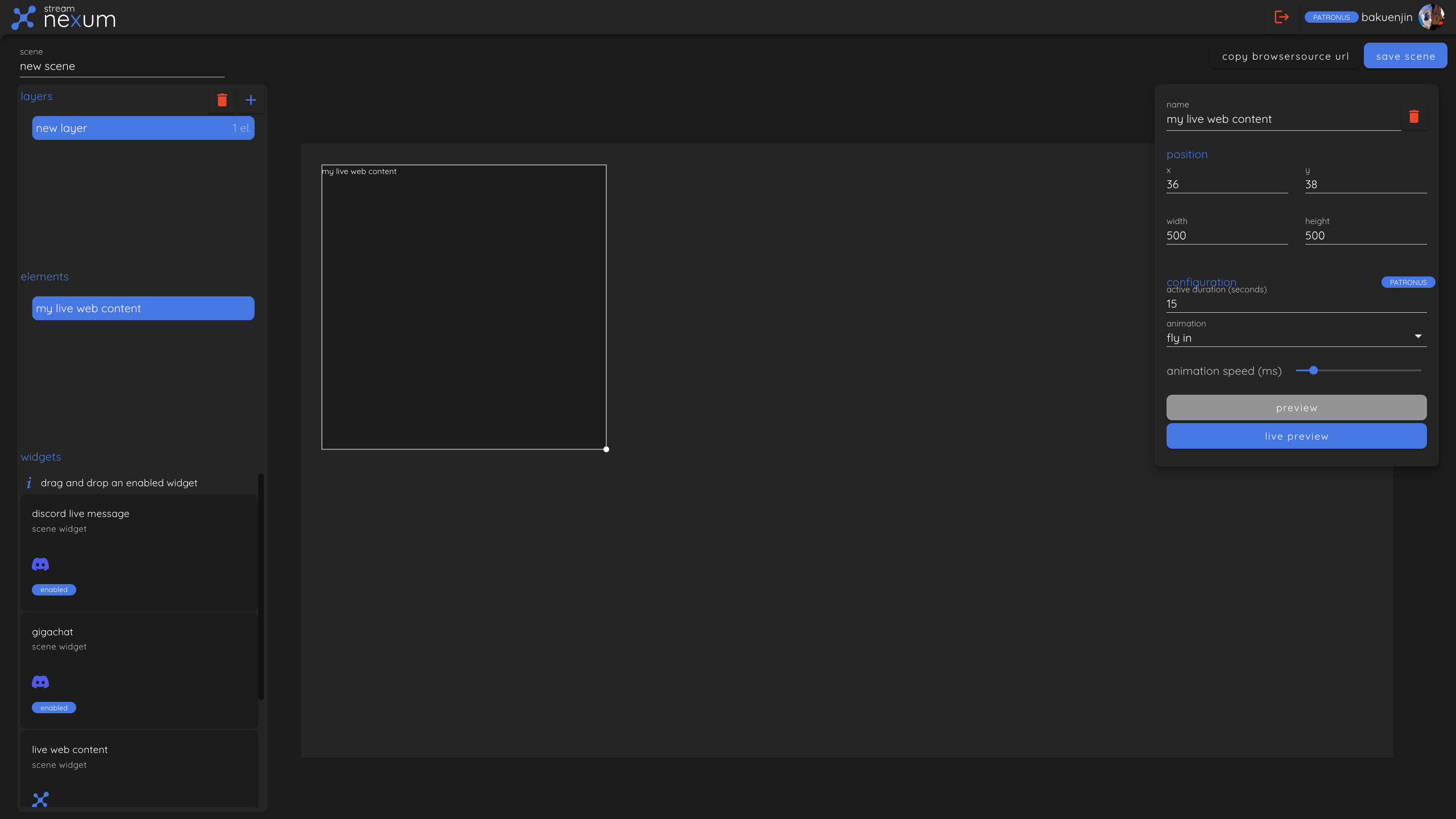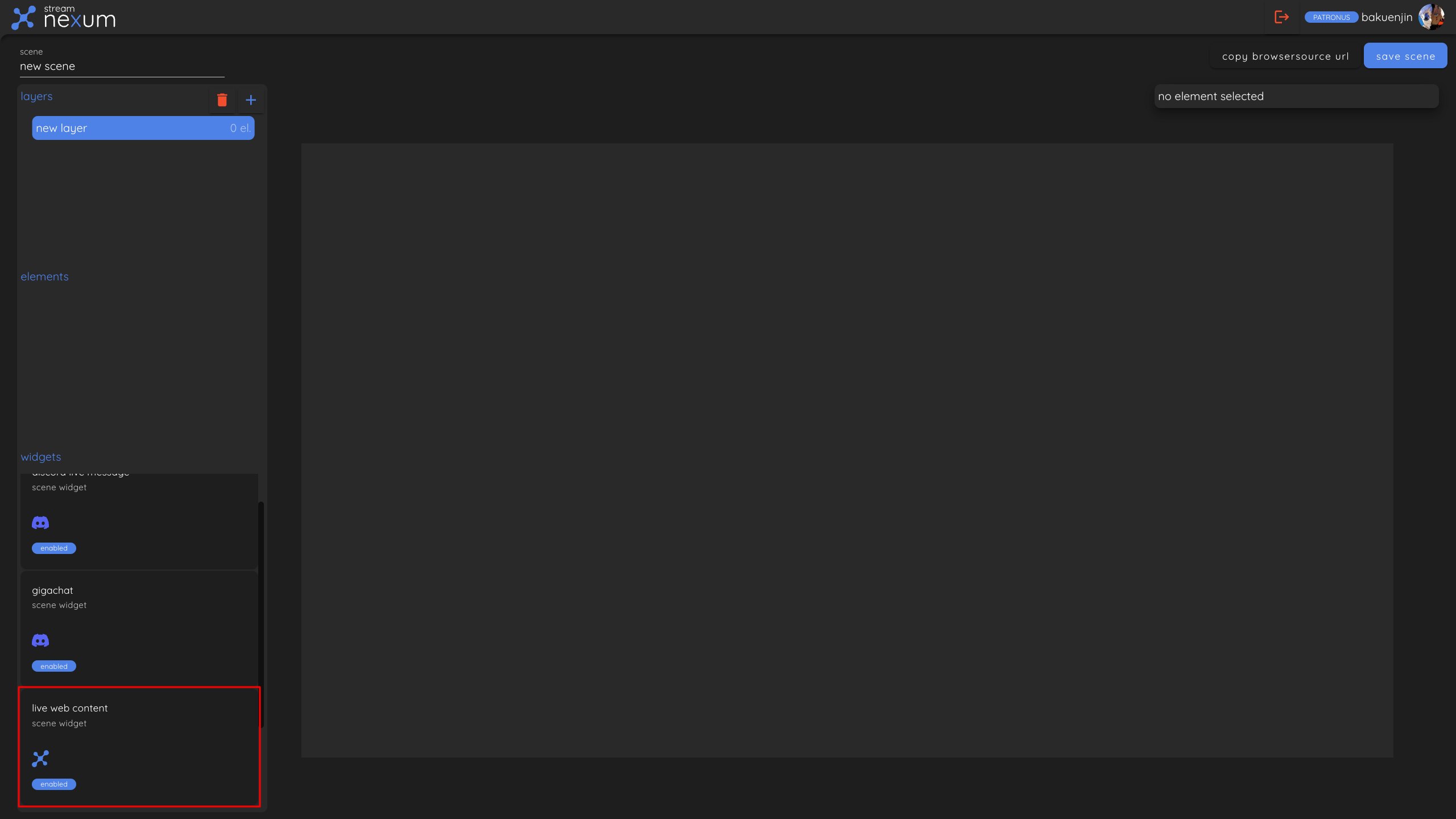 Once you have a scene open, you can add the "Live Web Content" widget to the scene by dragging and dropping it from the bottom-left to the scene in the middle.